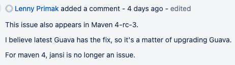 해당 maven의 이슈도 Apache에 보고되어 https://issues.apache.org/jira/browse/MNG-8399?page=com.atlassian.jira.plugin.system.issuetabpanels%3Acomment-tabpanel&focusedCommentId=17939366 에서 찾을 수 있고, 4일전에 아래와 같은 댓글이 달려있고 maven에서 사용하는 guava 종속성을 업드레이드 할것으로 보입니다